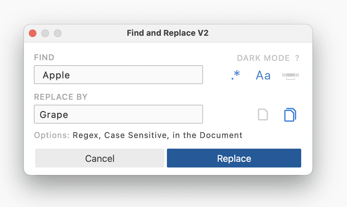 Find and Replace V2 是一款Sketch内文本查找与替换工具。当全局的某些标签文案或描述文本需要批量调整时,用它就能轻松实现全局的文本替换,支持正则表达式、区分大小写或单词、也提供暗黑界面。不过全局模式下可能需要一些时间才能完成一次替换任务,个人建议使用逐页模式,一页一页替换并检查。